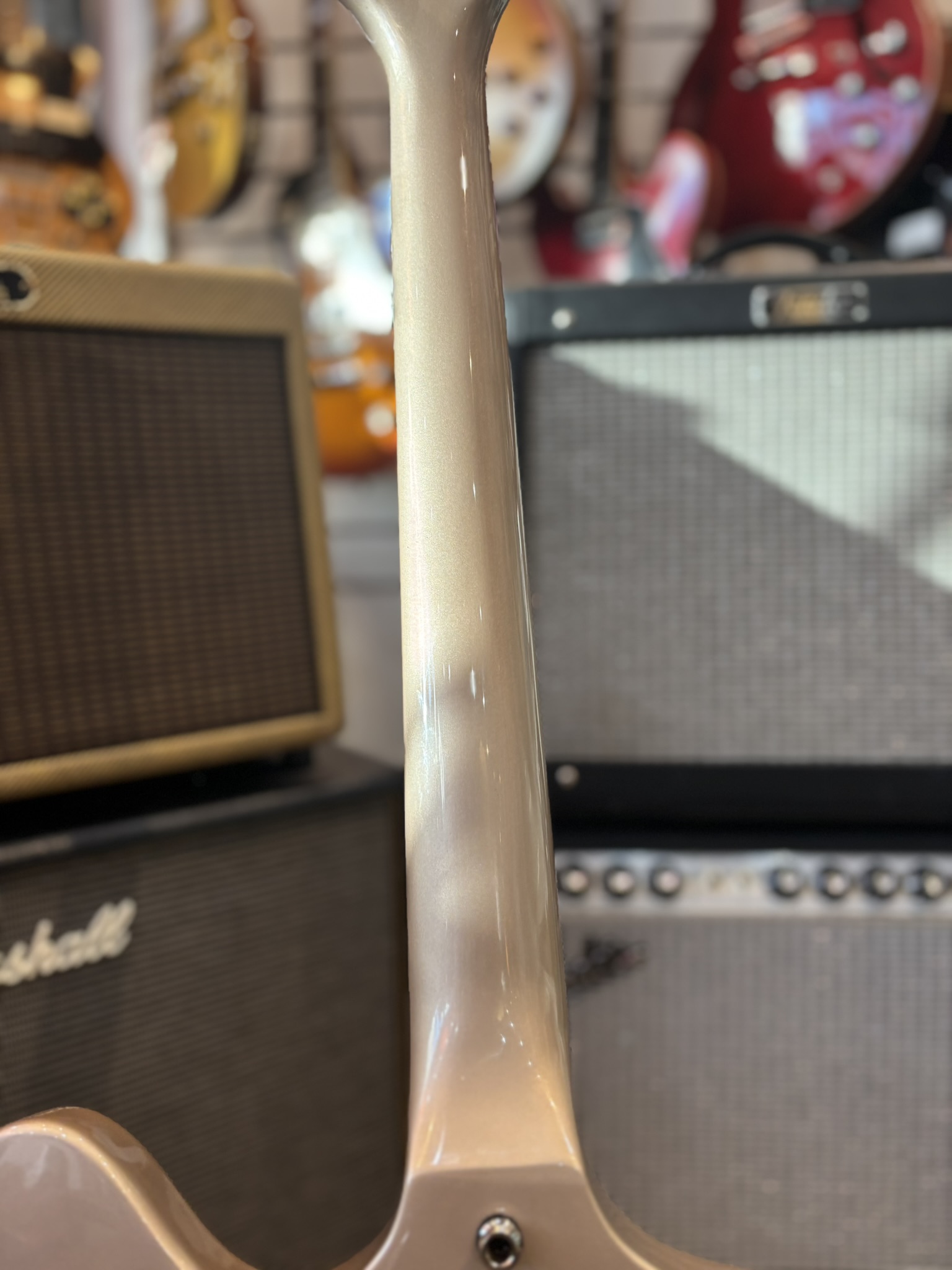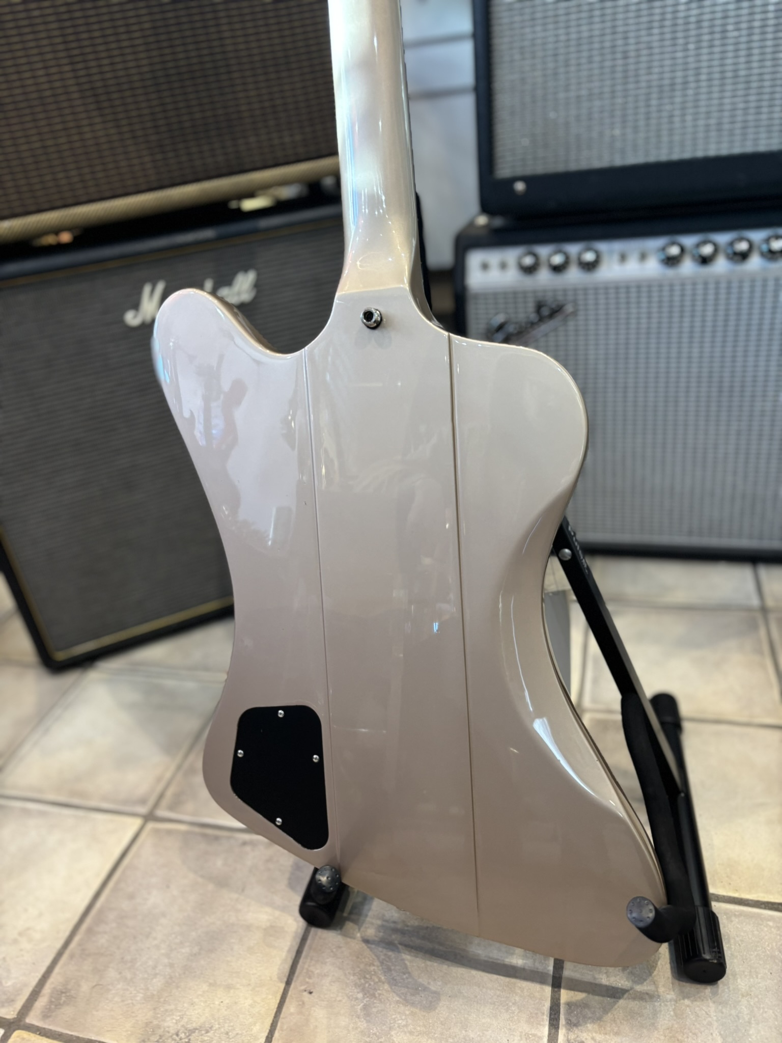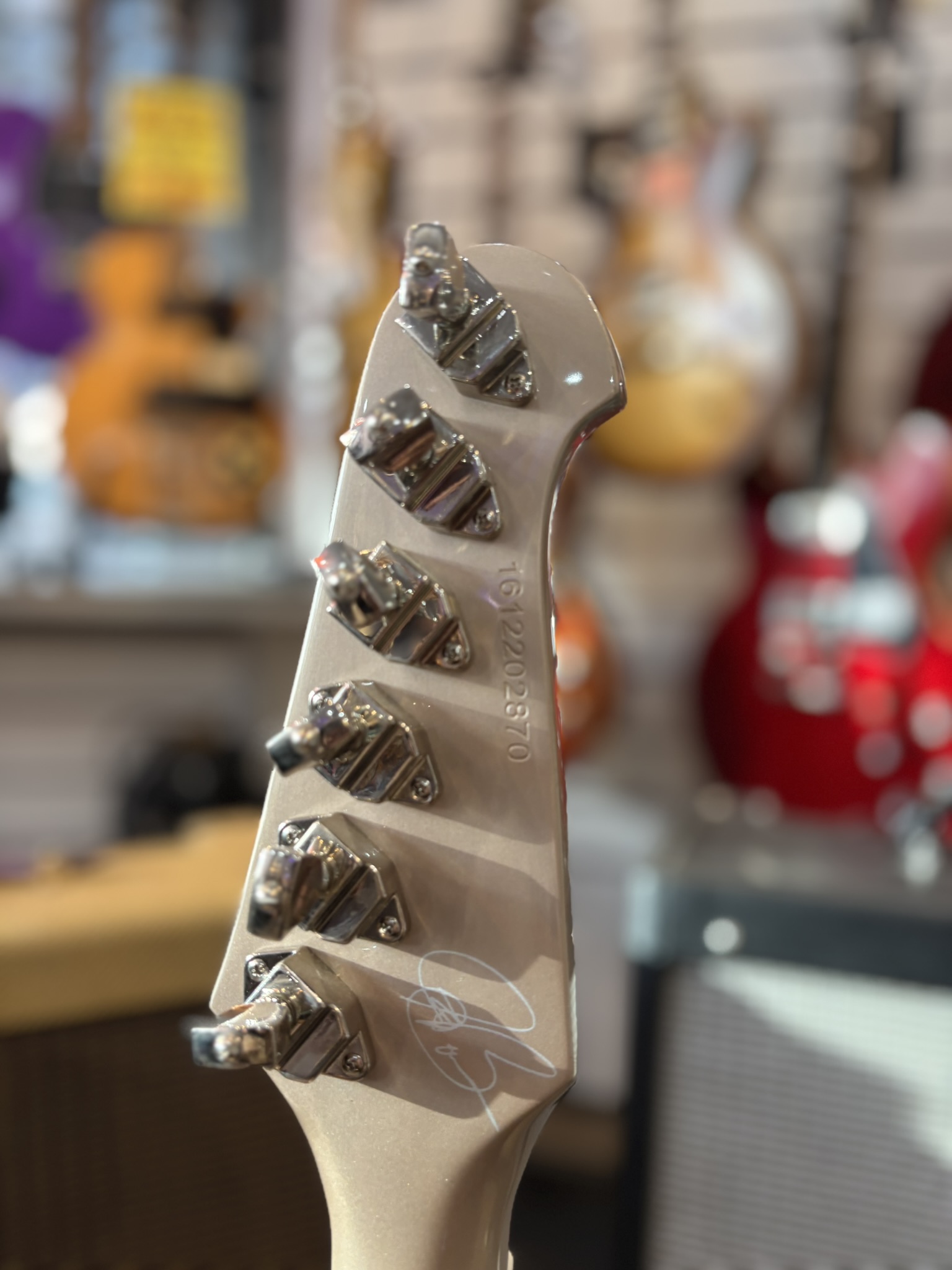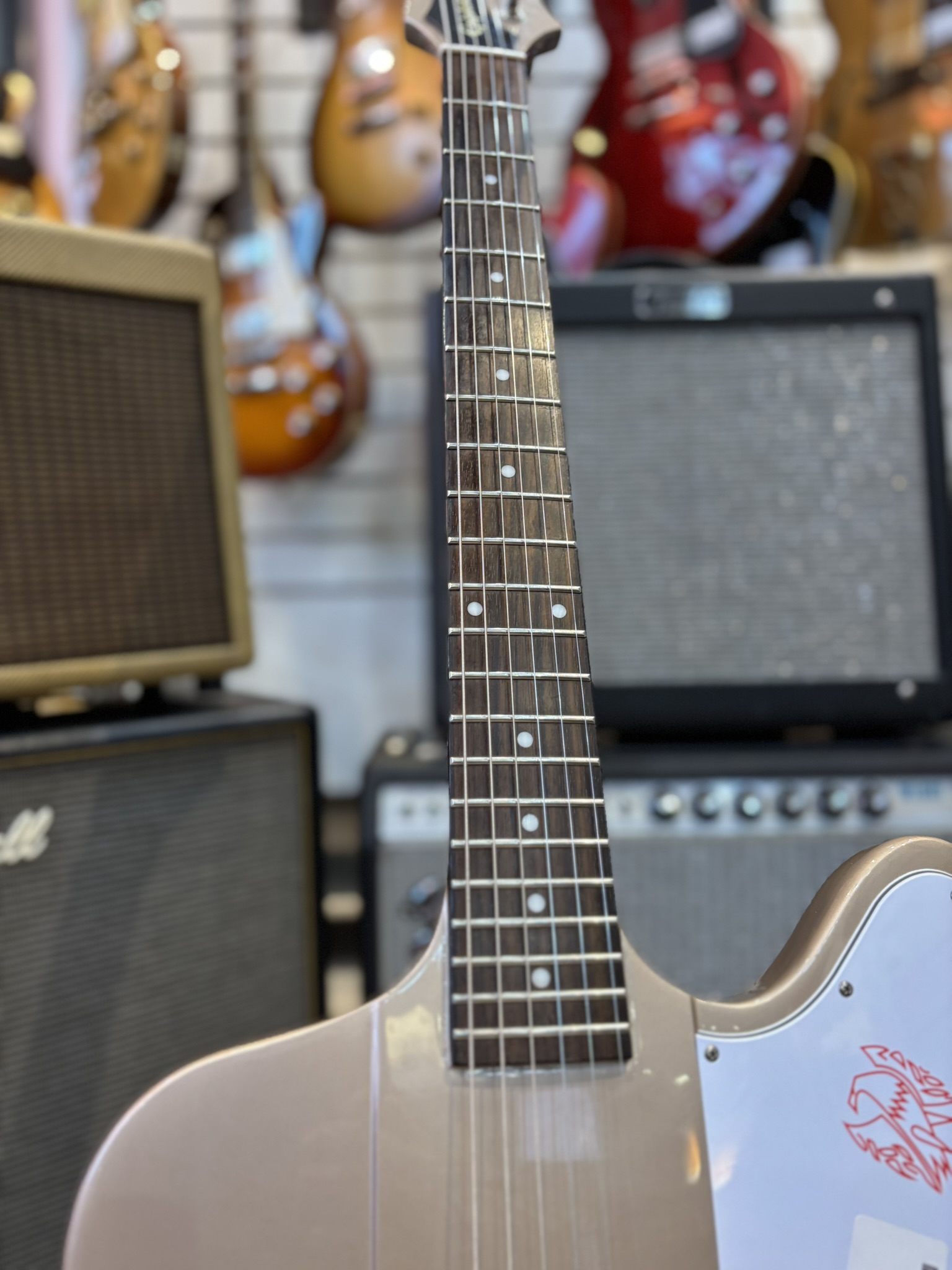 Har suttit ett annat plektrumskydd någon gång i tiden så det är dubbla skruvhål annars fint skick.