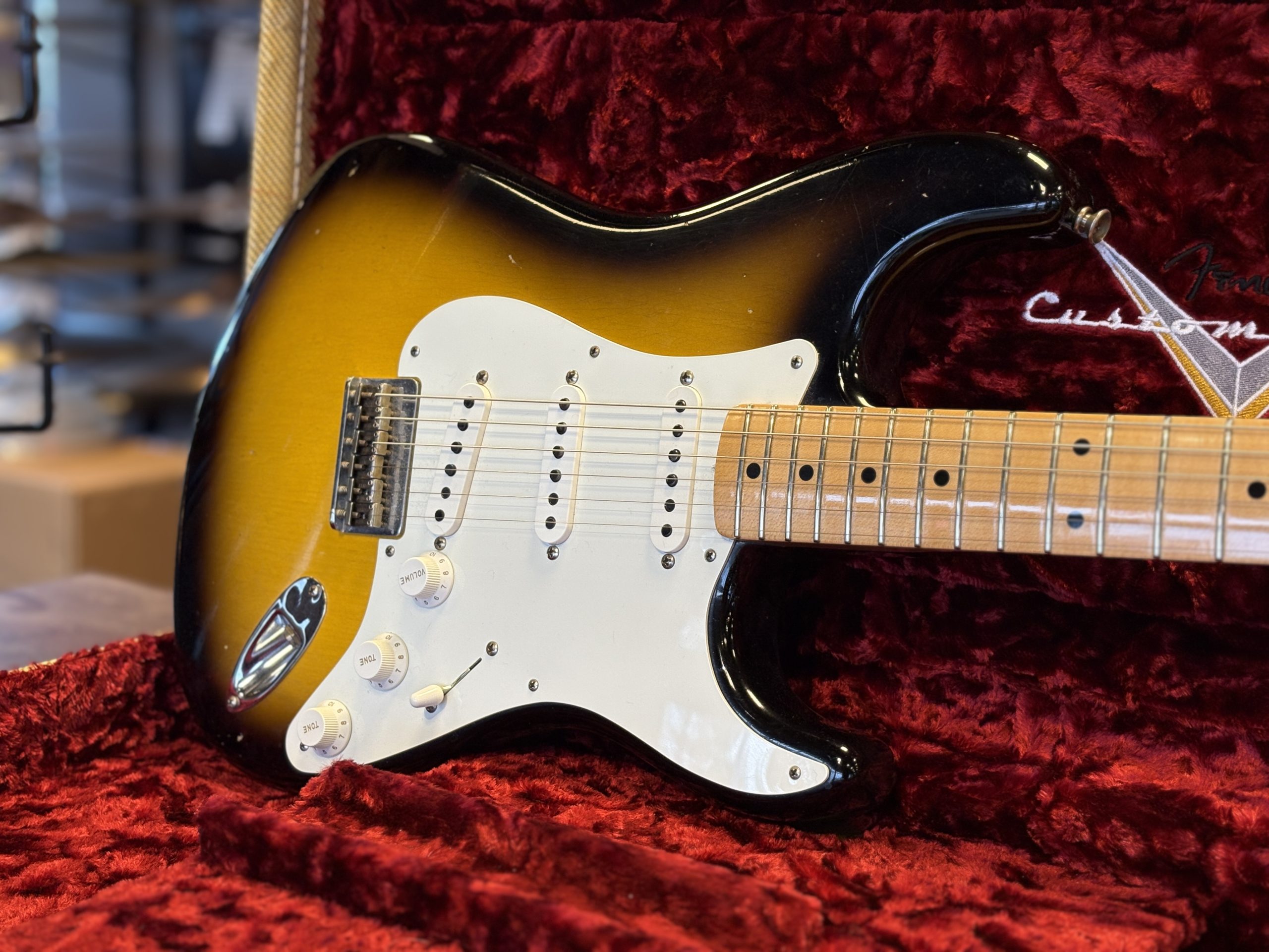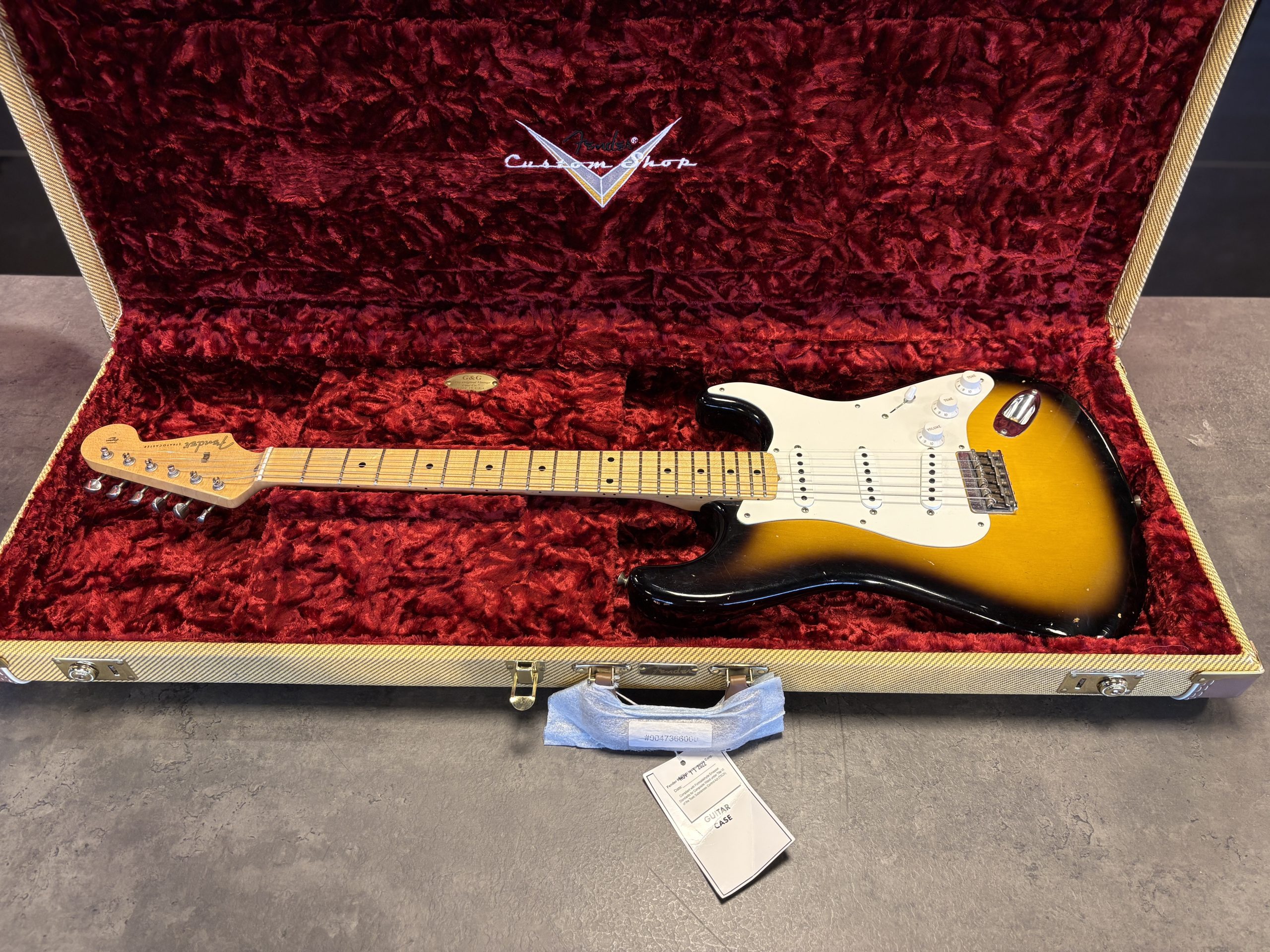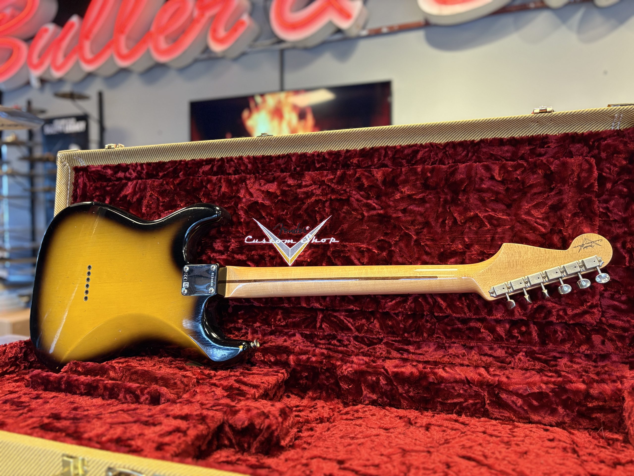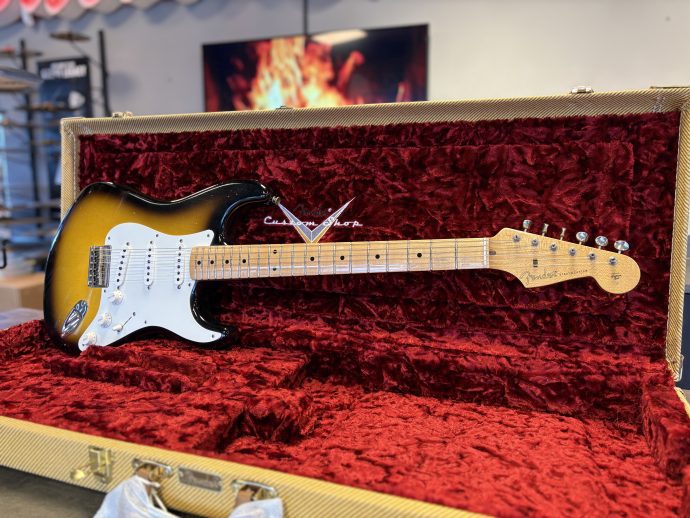 Fender Custom Shop ’56 Stratocaster Journeyman Relic i 2-Tone Sunburst. Serial: R124846. Vikt: 3,1 kg.