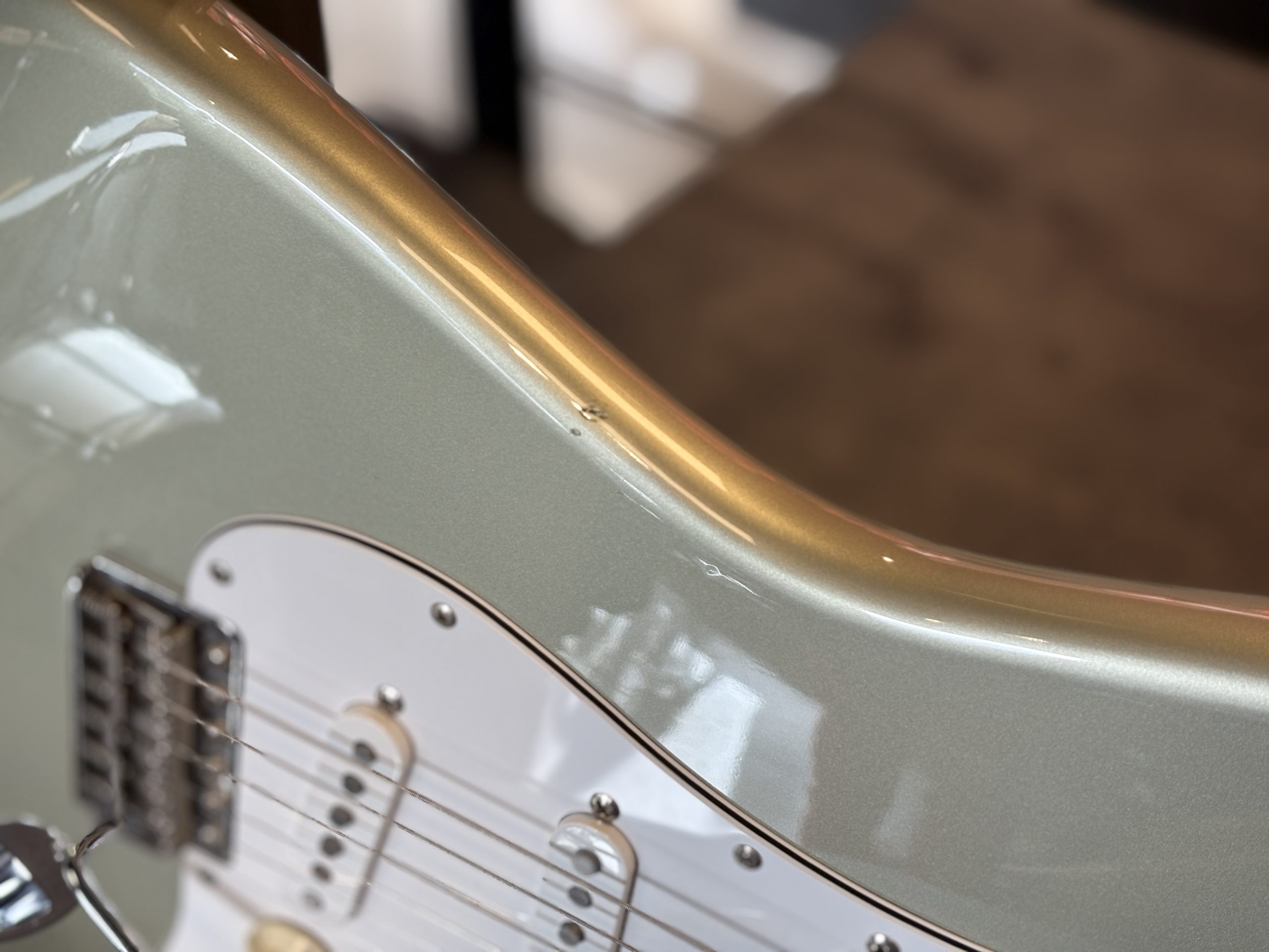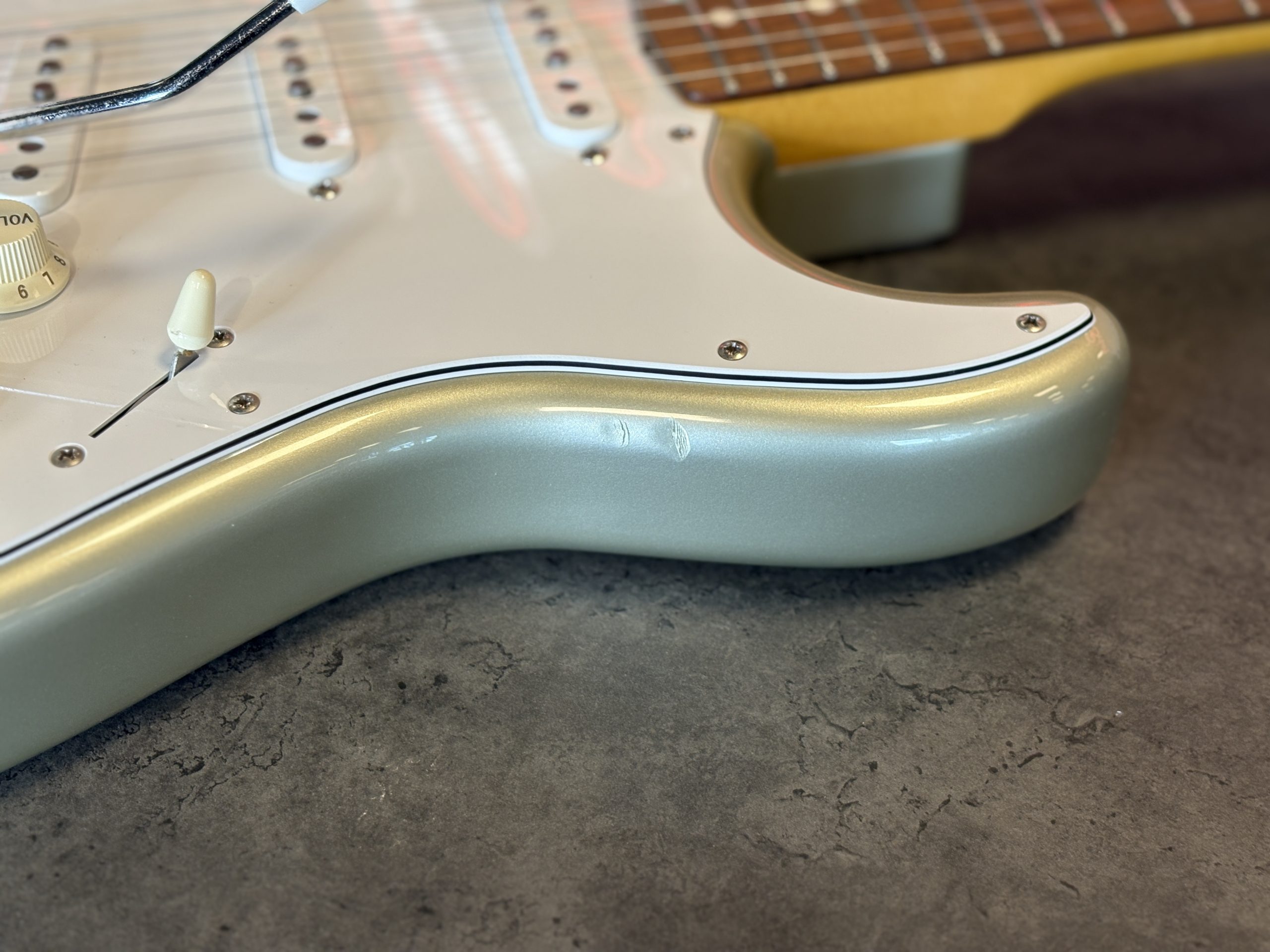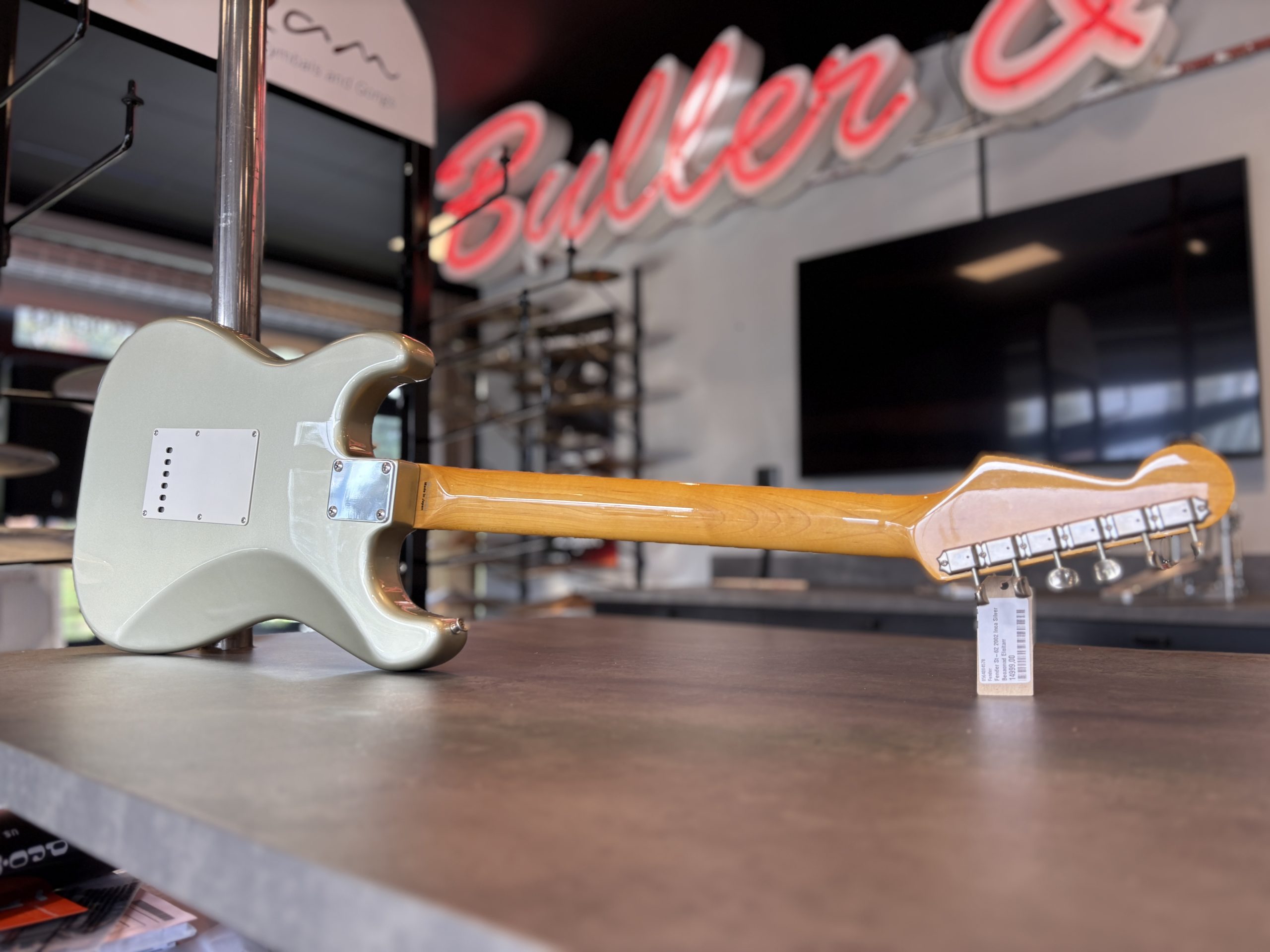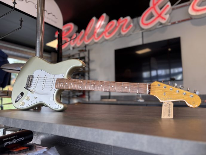 Helt original förutom outputjacket som vi bytt i butiken till ett nytt Switchcraft, nya D’Addario EXL 110 10-46 sitter också monterade.
