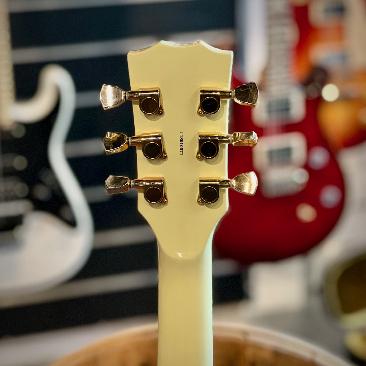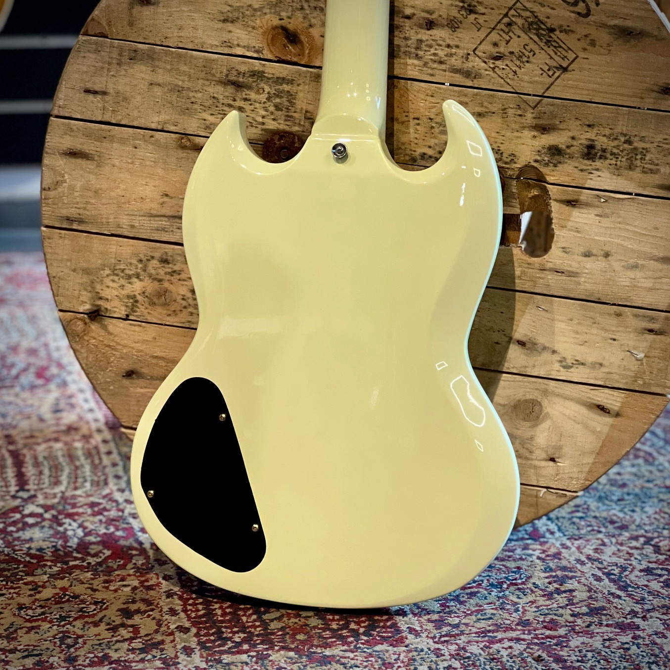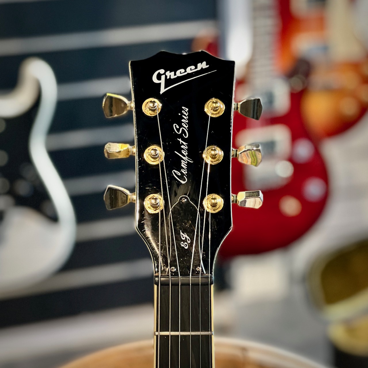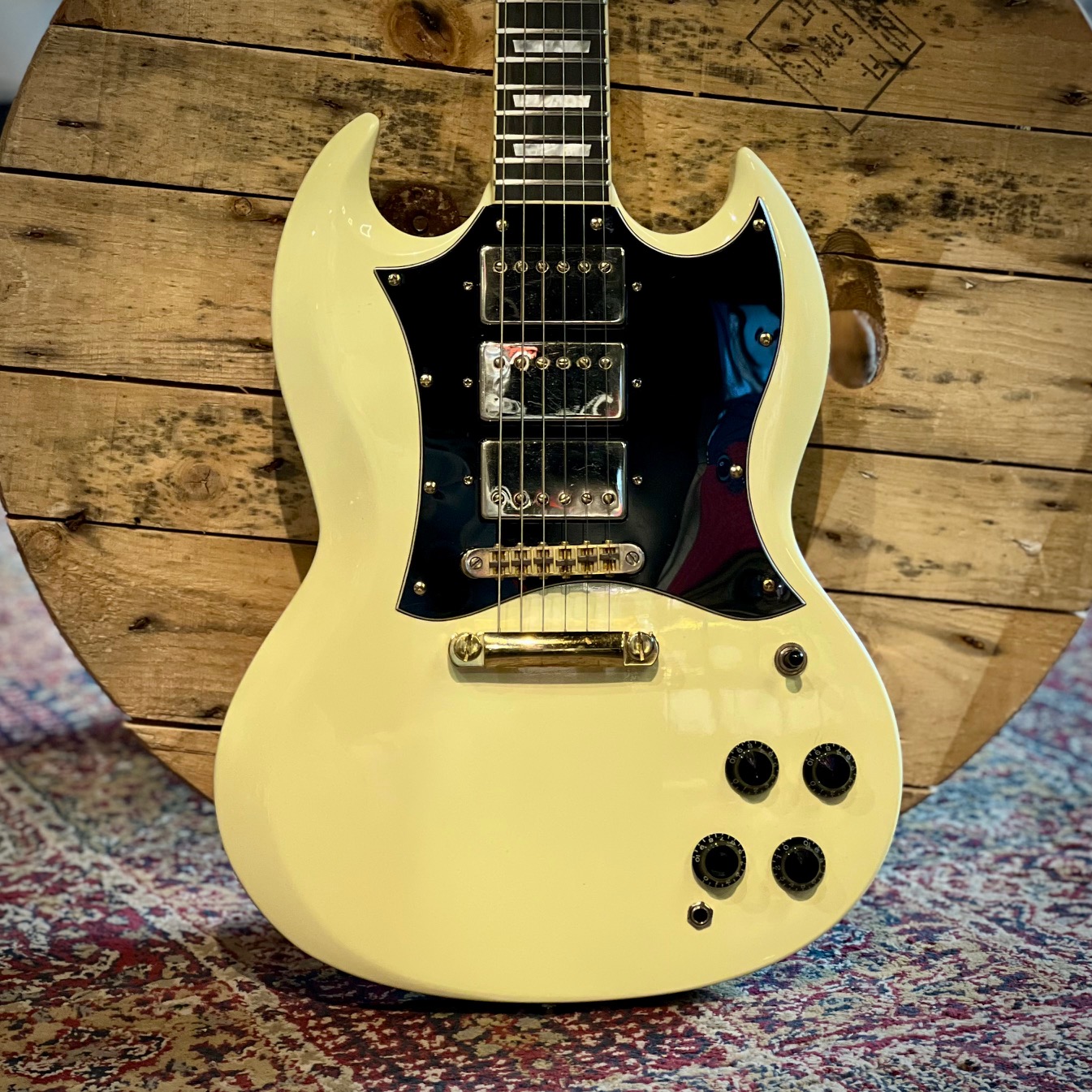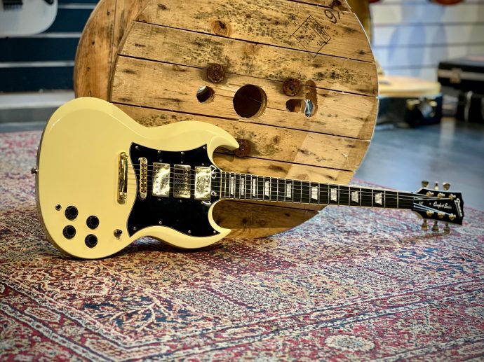 Begagnad Green SG med tydliga tecken på användning. Otroligt vackert cream white med tre humbuckers och faded gold hardware. Blir inte coolare än så för den pengen.