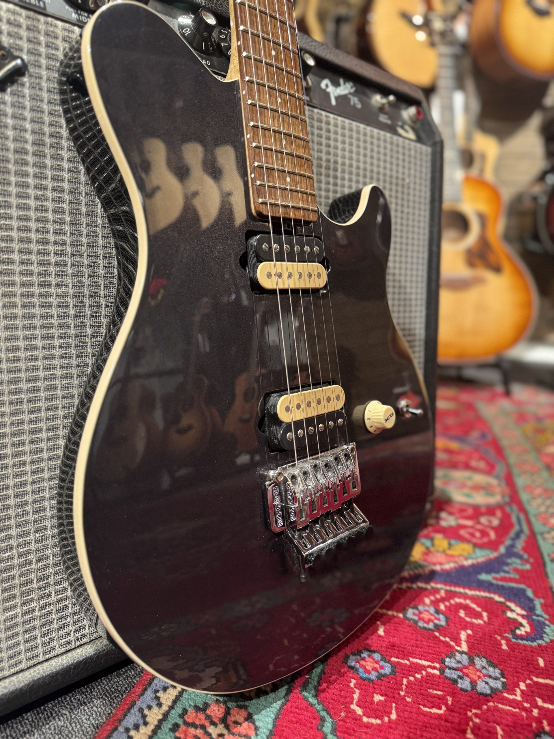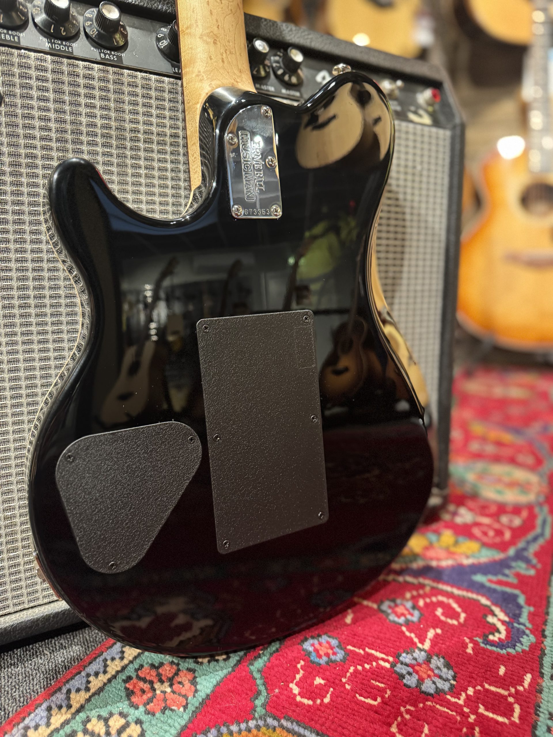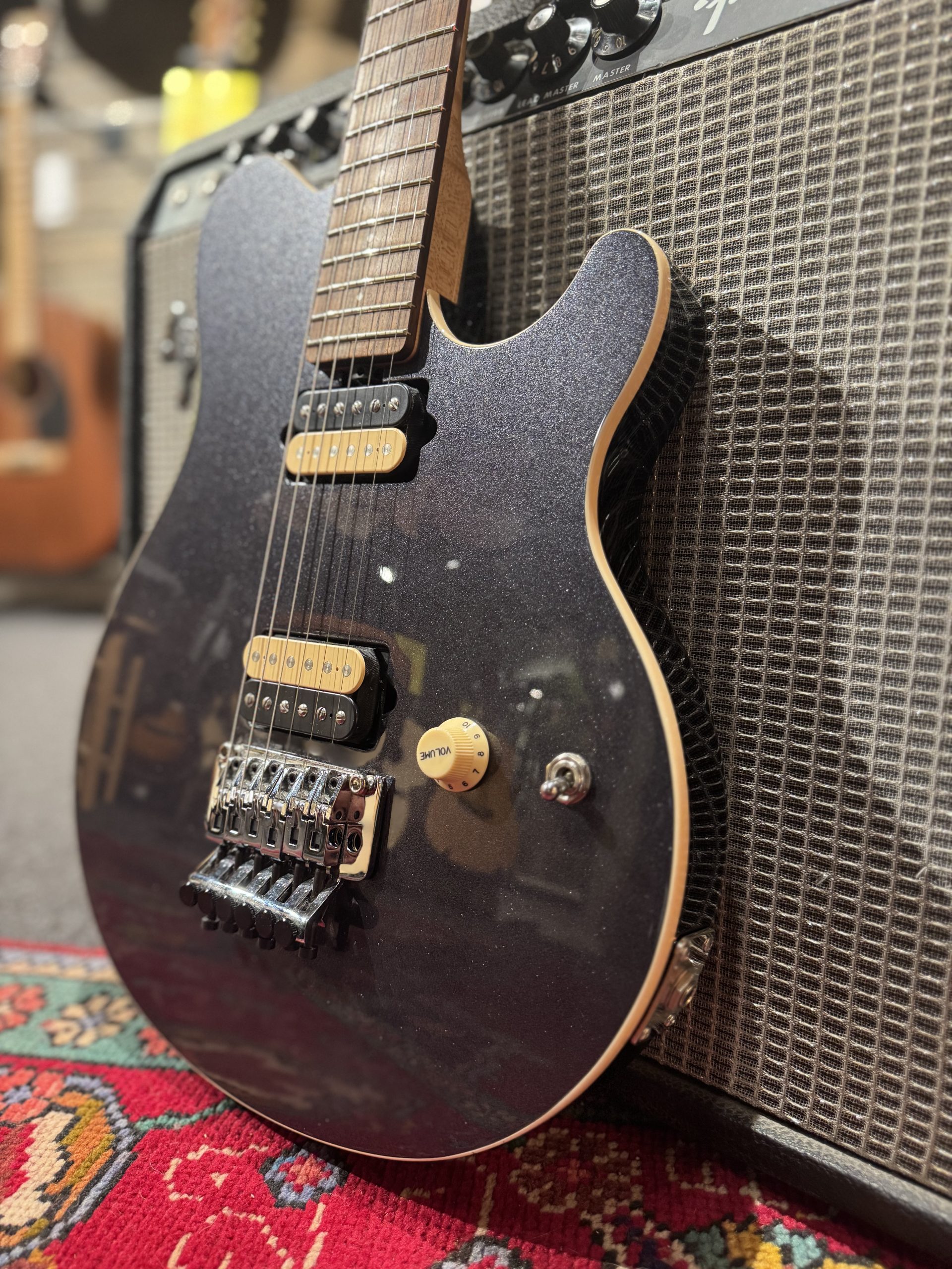 Superfin Musicman Ernie Ball Axis från 2016 i Zapphire Black! Har en grymt snygg diskret sparkle som blir tydligare ju närmare man tittar.