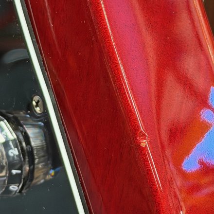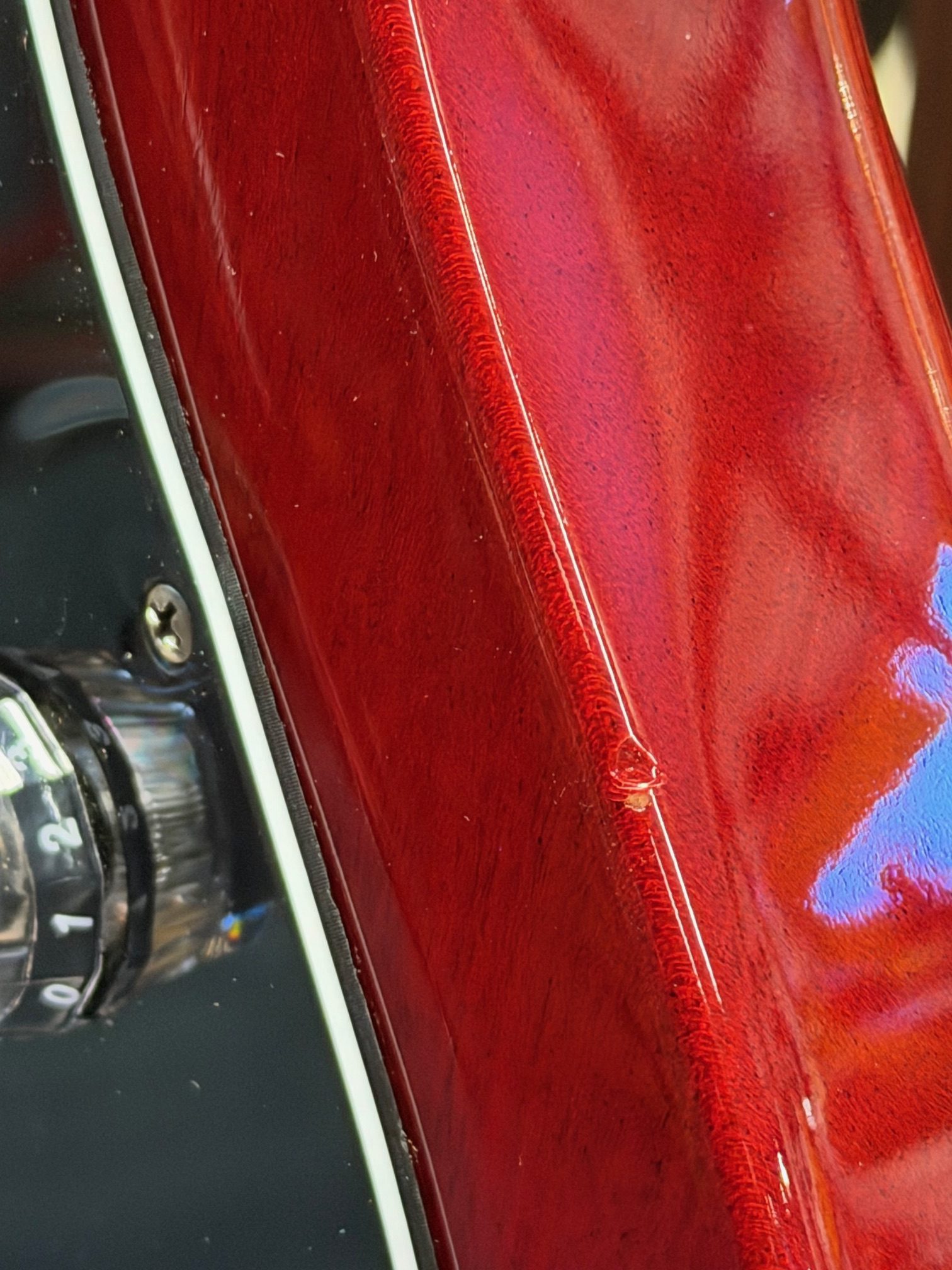 Några små dings och lite märken efter bälte på baksidan av kroppen.