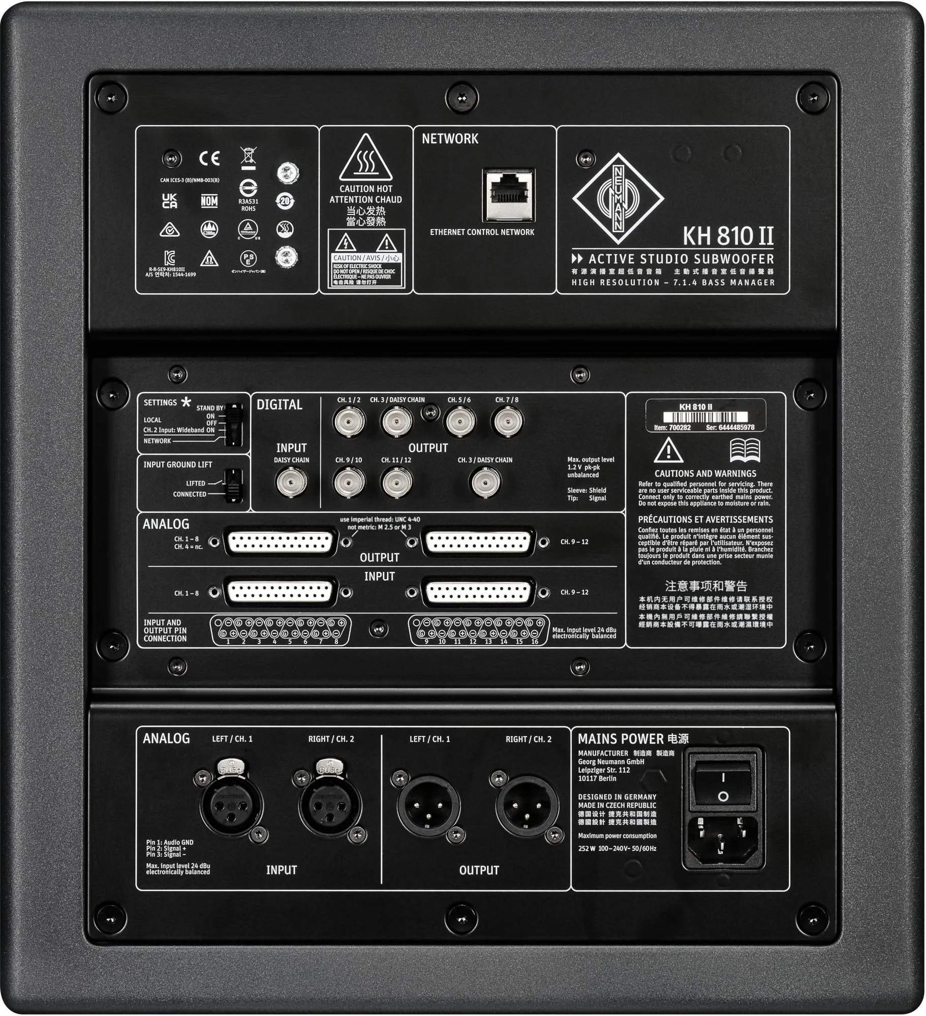 Den integrerade bass manager-funktionen gör det möjligt att konfigurera allt från traditionella stereosystem till avancerade surround- och immersiva uppsättningar upp till 7.1.4. Med flexibla anslutningar via balanserade XLR, SUB-D25 och digitala AES3-utgångar kan KH 810 II distribuera signal till upp till 11 monitorer, vilket gör den till en kraftfull hub i moderna studiomiljöer. Kombinationen av analog och digital signalhantering möjliggör sömlös integration i både klassiska och hybrida arbetsflöden.