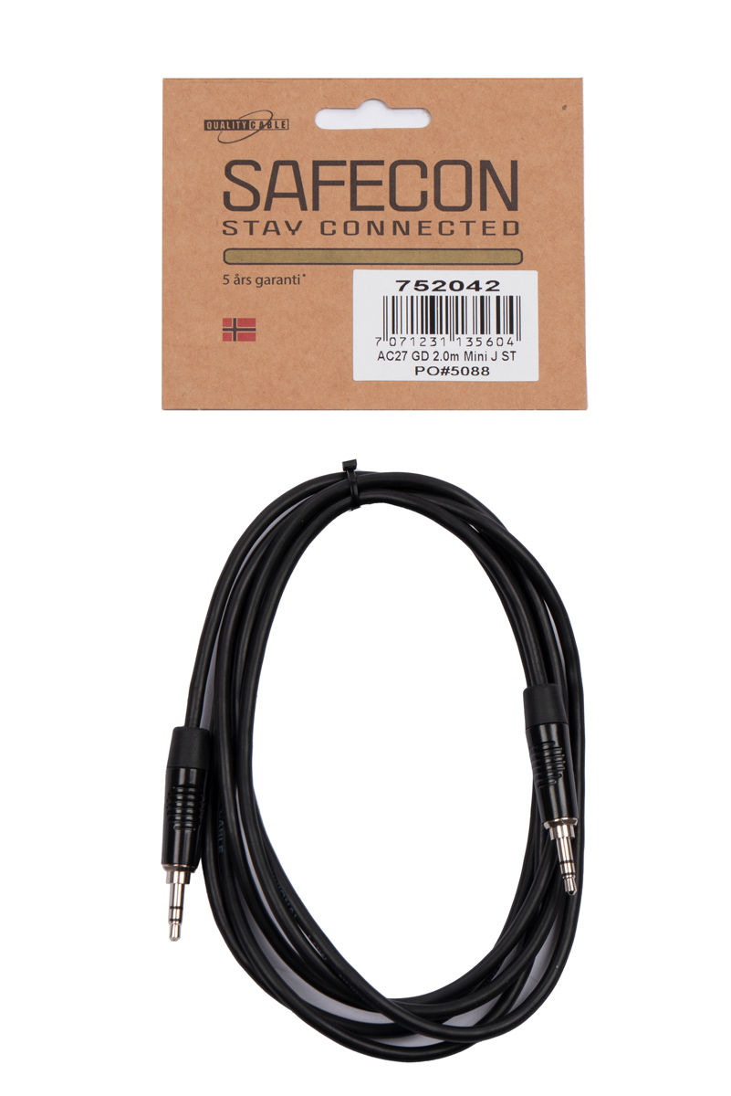 Safecon AC27 är en signalkabel med stereo minijack-kontakter i båda ändar, utvecklad för stabil och pålitlig signalöverföring mellan enheter med 3,5 mm anslutning. Kabeln lämpar sig för uppkoppling mellan exempelvis datorer, mobiltelefoner, hörlursutgångar och andra ljudkällor.