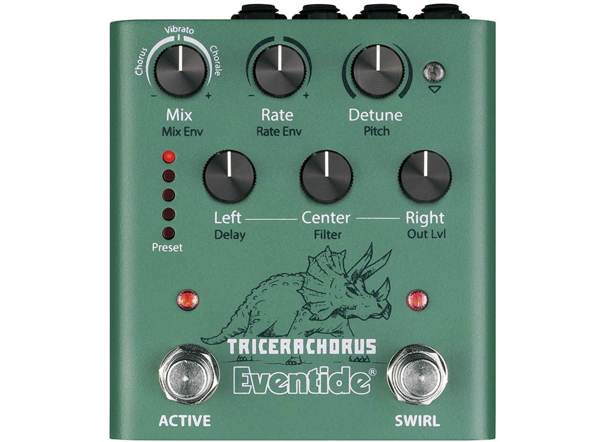 TriceraChorus parar ihop rik Bucket Brigade-stil körning med Eventides legendariska MicroPitch avstämning för en frodighet som rivaliserar djunglarna från sent Kritaperioden. TriceraChorus har tre körningsröster och tre unika körningseffekter som kan användas för att skapa en bred stereospridning med pulserande vågor av modulation. Den innovativa “Swirl”-fotbrytaren lägger till psykedelisk flanger, fasning och Univibe-liknande toner. Det har aldrig varit enklare att justera sirapslen djup modulation på gitarr, bas, synth, strängar, sång och mer.