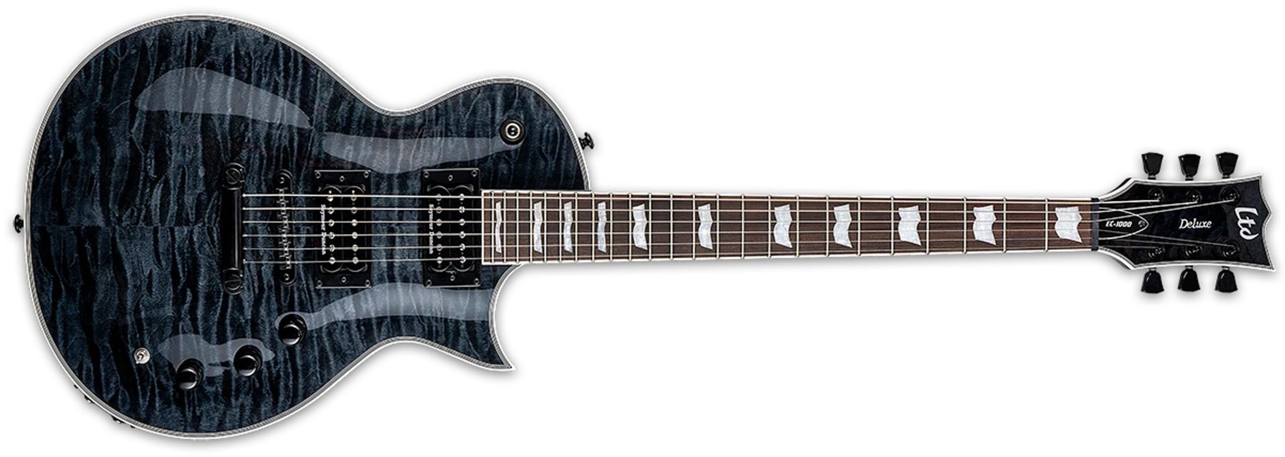 As one of the most innovative and versatile guitars in the LTD Deluxe Series, the EC-1000 PIEZO is our first model to include both standard magnetic pickups as well as a completely separate piezo pickup system. Piezo pickups create a very different sound from typical magnetic pickups, offering excellent articulate, acoustic-like tones. With the EC-1000 PIEZO, you can use the mini toggle switch to select between the standard pickup set — the excellent Seymour Duncan ’59 and JB — and a Fishman Powerbridge and Tailpiece, or even combine them both. This level of sonic flexibility continues to the guitar’s dual output jacks, allowing you to route the pickups to different combinations of amplifiers or interfaces onstage for live performances or in the studio for recording sessions. The EC-1000 PIEZO offers a great-looking quilted maple top on its mahogany body, and is available in See Thru Blue and See Thru Black finishes.
