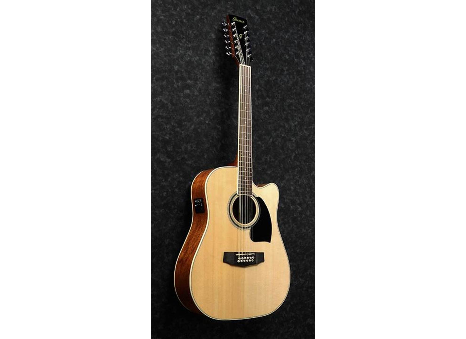 12-strängad akustisk Western-gitarr, cutaway, Okoume, Nyatoh, Ovangkol, 20 band, Ovangkol-stall, Ibanez Under Saddle-pickup, Ibanez AEQ-2T preamp och stämapparat, PF Performance-serien
